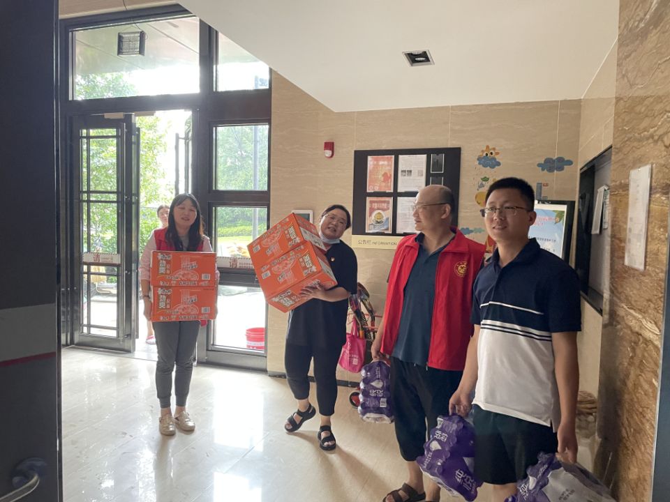 该小区内都是高层楼房,由于地下室被淹,造成停水停电,有很多是困在家里无人照顾的老人、小孩及孕妇,现急需把救灾物资徒步运送上楼。党员教师们毫不犹豫的扛起物资,从1楼到34楼挨家挨户进行分发,当受灾群众打开门看到浑身湿透、气喘吁吁的志愿者们,他们非常的感动,没想到来得这么快,真及时,口中表达真诚的感谢。经过半天的努力,所有物资全部分发完毕。