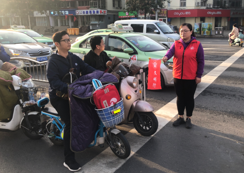 党员志愿者身穿红色志愿服,手持文明交通旗,参与到路口站岗执勤,维持交通秩序的工作。志愿者对横穿马路、乱闯红灯等违反交通规则的行人进行了劝阻提醒,纠正其不文明行为,教育、引导市民遵守交通法规,同时志愿者们还热心地为路人解答疑问,耐心指路。