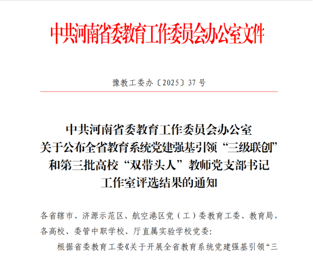 近日,省委教育工委印发《关于公布全省教育系统党建强基引领“三级联创”和第三批高校“双带头人”教师党支部书记工作室评选结果的通知》(豫教工委办〔2025〕37号),Beat365正版唯一官网必一党总支成功获评“全省高校党建工作标杆院系”培育创建单位。