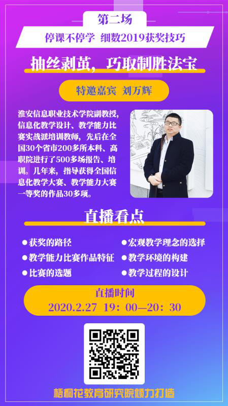 第二期是由淮安信息职业技术学院刘万辉教授主讲的“停课不停学,细数2019教学能力比赛获奖技巧”。刘万辉教授以2019年教师教学能力比赛作品为切入点,细致深刻地剖析了教学能力比赛需要准备的材料、比赛的突破方式、不同作品类型的塑造模型、教学设计的要素与方法、教学过程的组织实施策略以及比赛网评提交教学材料的准备技巧,尤其对课堂思政融入信息化教学设计中的有效应用进行了认真分析。