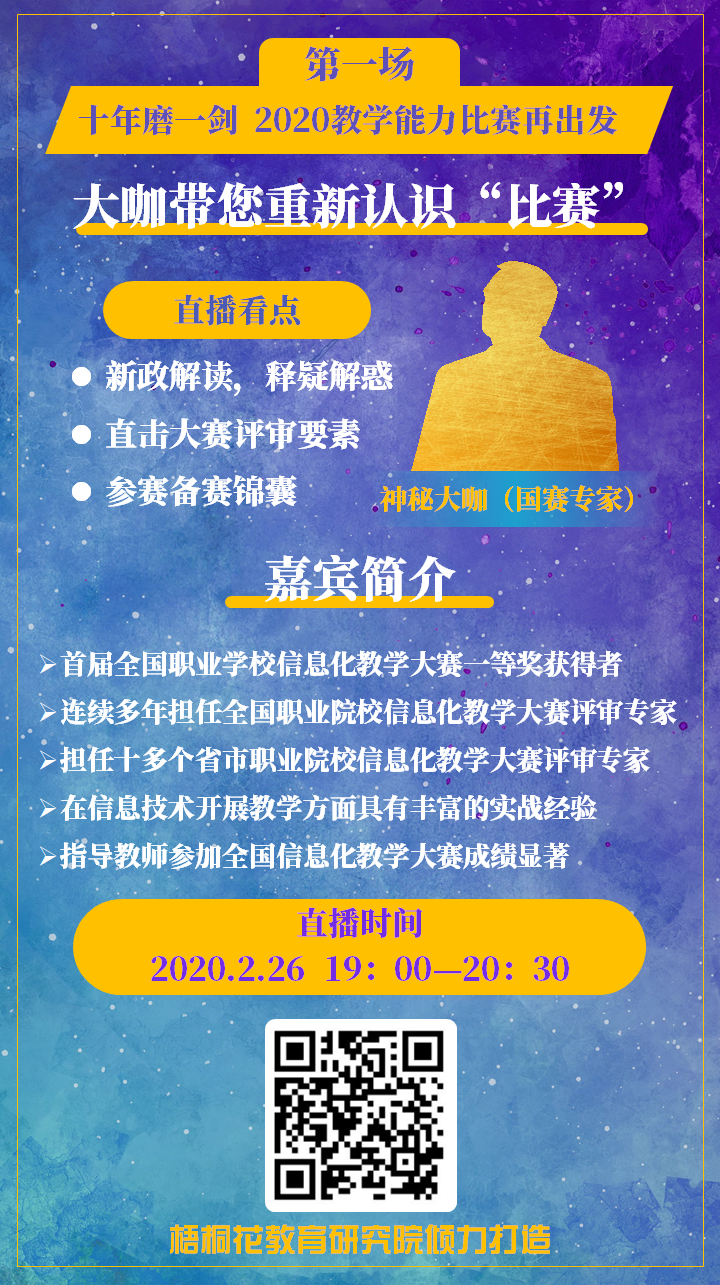 直播共两期,第一期是由厦门市教育科学研究院陈振源教授主讲的“十年磨一剑,2020教学能力比赛再出发”。陈振源教授多年来潜心钻研职业教育教材及课程标准制定,连续多年指导全国信息化教学大赛工作,在现代教育思想和教学理念的结合方面有着独到的见解。陈振源教授围绕2019年教学能力大赛概况、以赛促教规范、职业教育发展新趋势、教学能力比赛新发展、课堂教学新变化与信息化技术新要求等多个主题,结合参赛作品案例,进行了全面深入的政策解读。并对备战2020年教学能力大赛提出了相关建议:参赛教师要学习赛程,熟悉相关的文件,参赛作品要回归教学,回归课堂。他还指出举办大赛是为了促进职业教育教学更加规范,信息化大赛将从重选手的现场表演转向重作品的内涵,从重作品的技术包装转向重选手的综合素质,使职业教育正规向好发展。