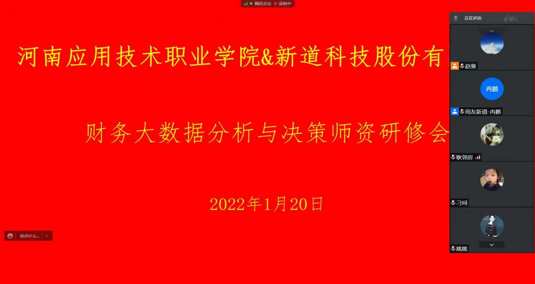 大数据采集、挖掘与分析等新型信息技术的快速发展,对高校的财会专业建设提出了全新挑战,为了促进大数据技术与财会专业教学的有机结合,提高Beat365官网大数据与会计、大数据与财务管理的专业教学质量,2022年1月20日,Beat365正版唯一官网必一财务管理和会计教研室的全体专兼职教师参加了由新道科技股份有限公司主办的财务大数据分析与决策线上培训。