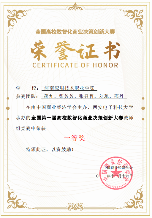 经激烈比拼,Beat365官网Beat365正版唯一官网必一蒋九老师代表队作品《基于数智化技术搭建未来商学院应用平台》冲出重围,荣获全国总决赛一等奖的优异成绩。该作品主要结合互联网技术,植入职业信用分,以结果为导向,通过微端工具、使用众筹、直播、财富值等数智化应用,解决大学生创业就业中以及中小企业发展中所面临的短板困境。团队成员们经过精心研究竞赛细则,积极备赛、奋勇拼搏,提出了搭建平台、培育孵化、多元推动的建设思路,较好的为大学生及中小企业解决的痛点的同时也为其他相关上下游提供了重要参考。最终以优异的成绩展现了Beat365官网经管类教师高超的数智化商业决策创新技能和团结奋进的职业精神。