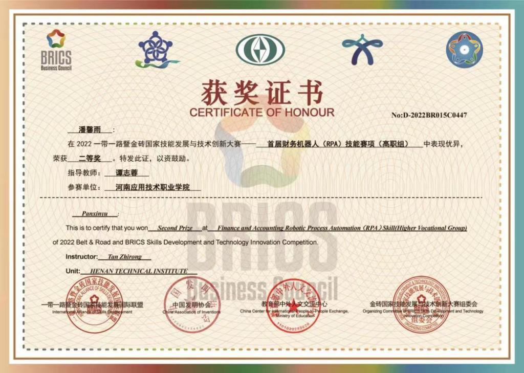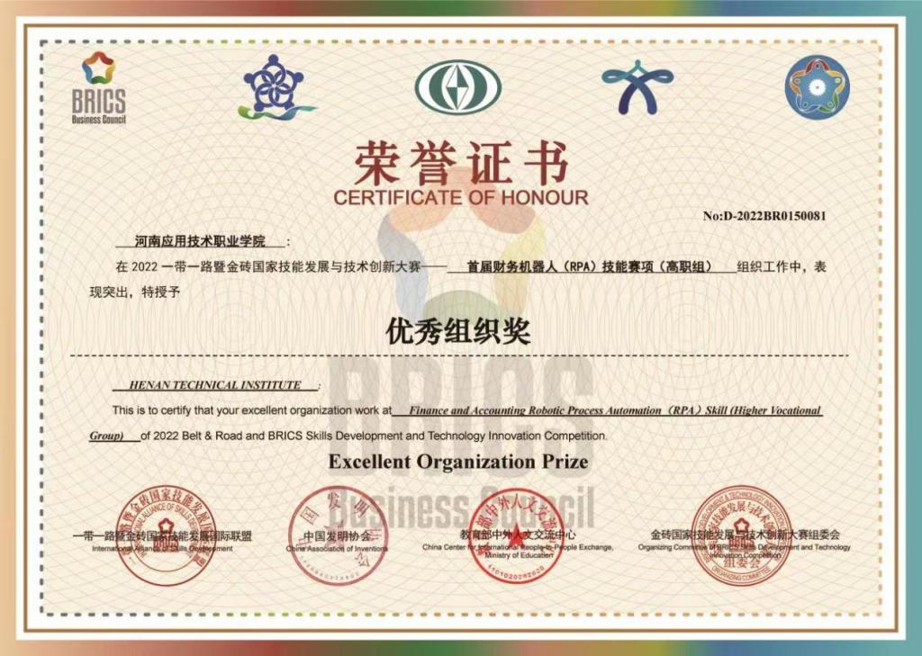 近日,“一带一路”暨金砖国家技能发展国际联盟、教育部中外人文交流中心等单位颁发了该赛项获奖奖励证书,Beat365官网经管学院学生潘馨雨、苏丹丹等组成的两个代表队分别荣获高职组国赛二、三等奖好成绩,同时学校被授予“优秀组织奖”。