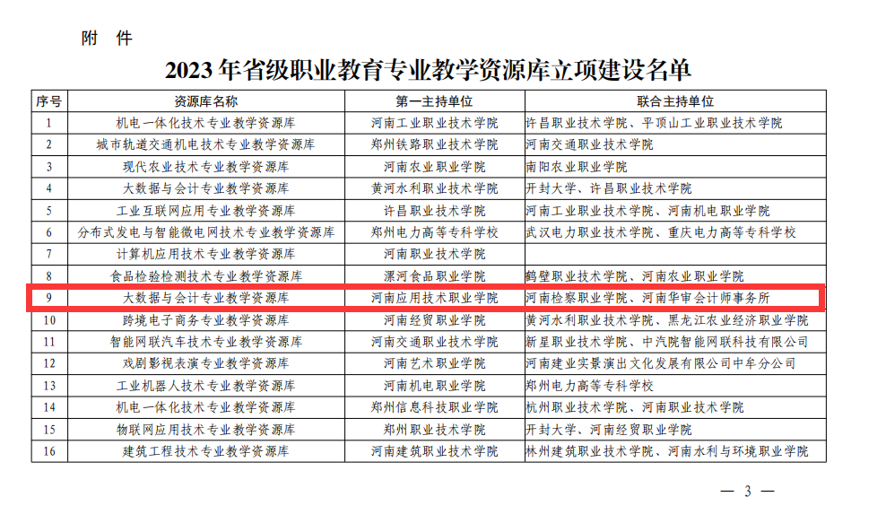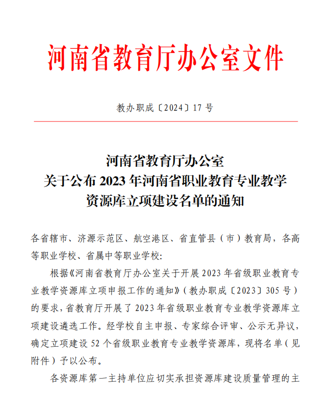 近日,河南省教育厅下发了《河南省教育厅办公室关于公布2023年河南省职业教育专业教学资源库立项建设名单的通知》(教办职成〔2024〕17号),Beat365官网主持的大数据与会计专业教学资源库获批立项建设项目。
