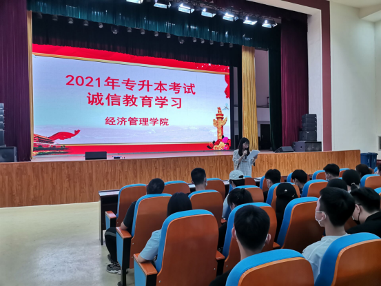 活动首先向同学们解读并传达了省、市招办以及学校专升本考试相关文件精神并宣传普及了《中华人民共和国教育法》《刑法修正案(九)》等警示教育内容,让学生认识到了诚实守信对个人成长的重要性和考试违规的严重后果。并向同学们详细讲解了“无声入场”的政策、注意事项和要求,让学生提前熟悉了“无声入场”的相关流程,明确了考场着装的具体要求,保证学生考试当天的顺利入场,为专升本考试做好充足的准备。