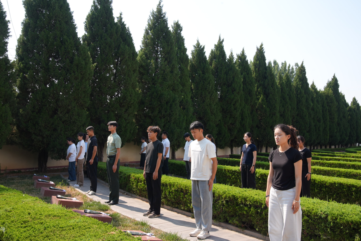 步入陵园,巍峨的革命烈士纪念碑肃然矗立,其19.49米的高度与抽象融合“5”“6”的碑体设计,无声诉说着“枪杆子里面出政权”的真理与烈士精神永耀日月的主题。在讲解员引导下,师生们步入安阳革命史纪念馆。讲解员用生动的语言,讲述馆内的五大主题:早期共产党人的光辉足迹、抗日战争时期的艰苦斗争、解放战争胜利前夕、社会主义建设探索之路、英雄模范人物事迹。一张张斑驳照片、一件件承载血火的遗物,将那段峥嵘岁月重现在同学们眼前。在庄严肃穆的烈士墓区,大家俯身轻抚墓碑,为安眠于此的465位英烈(含96位豫北战役无名烈士)拂去尘埃,敬献鲜花,以行动表达最深切的缅怀与景仰。