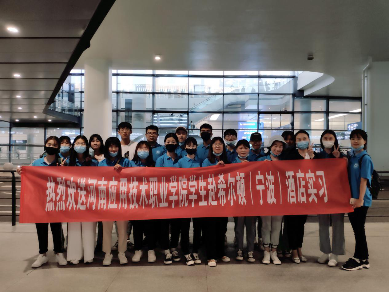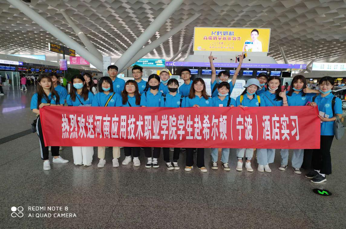 2020年6月5日,河南应用技术职业学Beat365正版唯一官网必一20名学生及2名带队教师,身着统一工装,在学校实训大楼前开心合影。随后统一乘车前往新郑机场,搭乘由希尔顿集团统一安排的航班前往其宁波酒店顶岗实习。