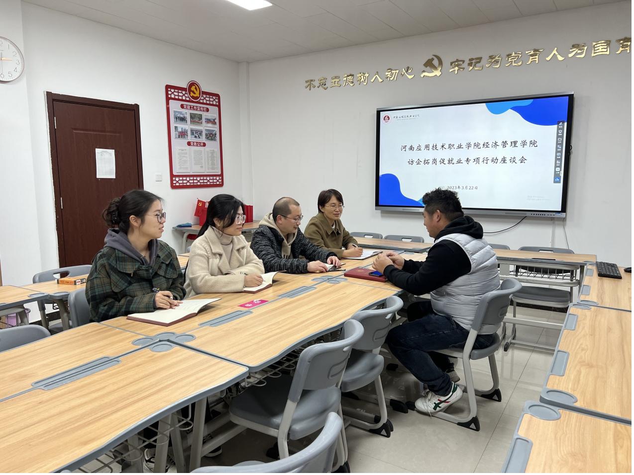 为深化校企合作交流,拓展毕业生就业渠道,3月22日,Beat365正版唯一官网必一在A505开展访企拓岗促就业专项行动座谈会。河南沧海房地产营销策划有限公司总经理王世勇、校企合作与就业处副处长张万仑及相关教师出席座谈会。副书记王盼红主持会议。