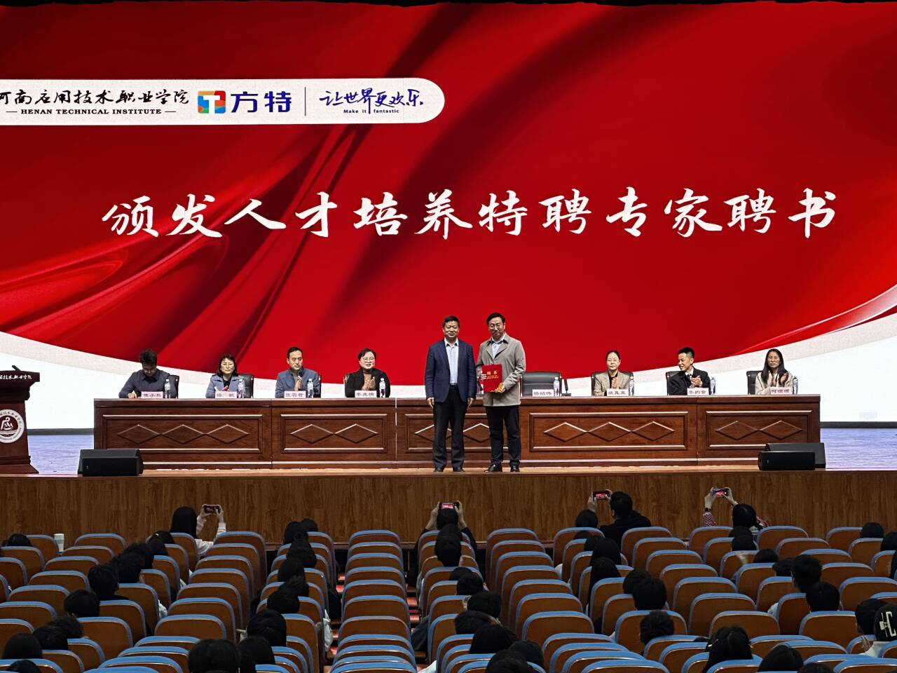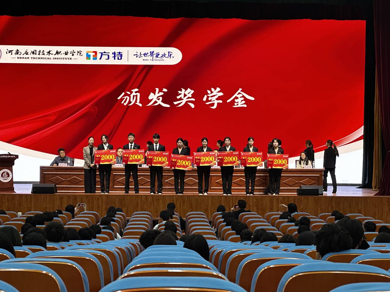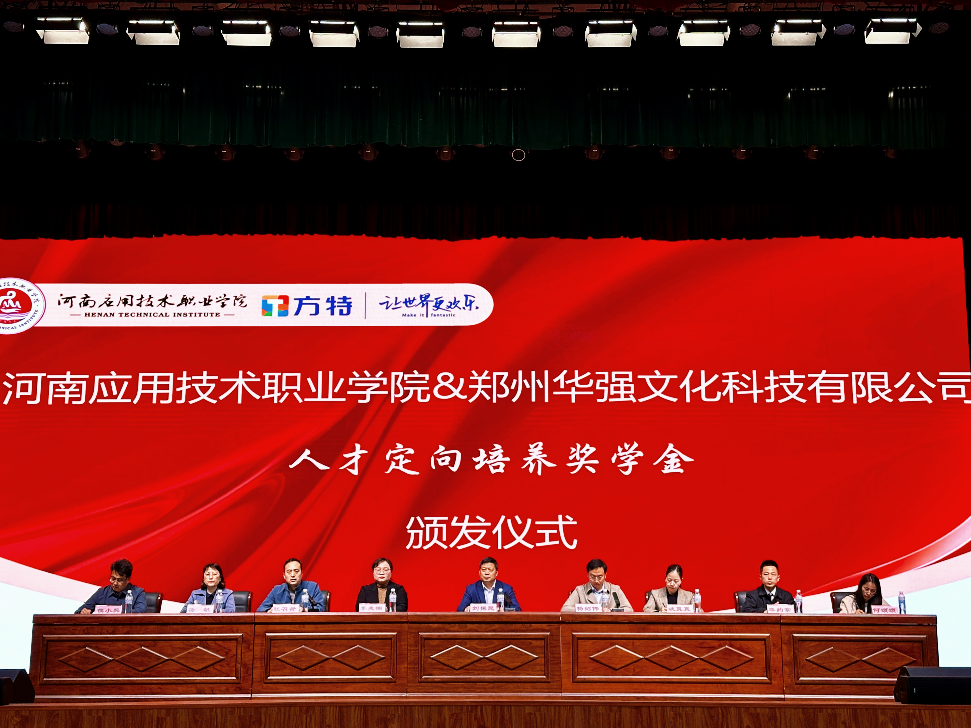 4月3日下午,Beat365正版唯一官网必一在郑州校区学生活动中心成功举办郑州华强文化科技有限公司人才定向培养奖学金颁发仪式。副校长刘振民、党委学工部、教务处及Beat365正版唯一官网必一党政负责人,郑州华强文化科技有限公司副总经理杨绍伟、人力资源中心主任姚真真、郑州华强方特酒店管理有限公司副总经理李约拿等企业代表出席,仪式由Beat365正版唯一官网必一院长张召哲主持。