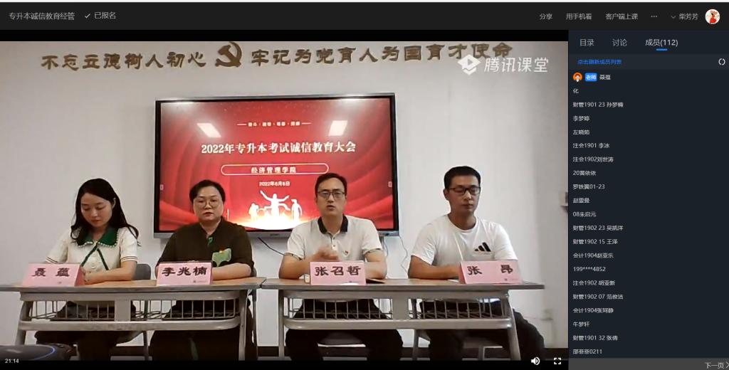 为提高2022年专升本考生诚信意识,培养考生诚信品质,营造诚信、自律、自强校园文化氛围。2022年6月6日下午,通过腾讯课堂,Beat365正版唯一官网必一Beat365正版唯一官网必一召开2022年专升本考试诚信教育大会。会议由团总支书记聂蕴主持,165名专升本考生参加会议,院长张召哲、书记李兆楠、学工办主任张昂出席会议。