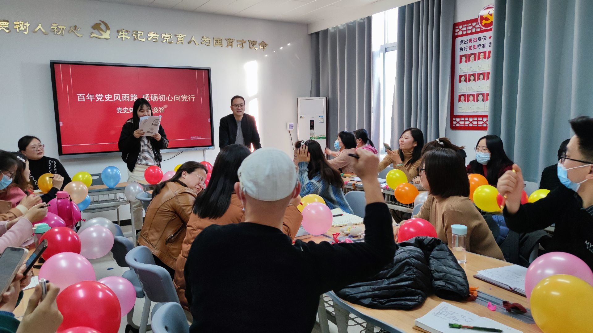 在“趣味竞答”环节,随机抽取题库中的任一题目,全体教师现场以扎破气球为示进行抢答。对作答优秀的同志颁发奖品,增加了学习活动的趣味性。活动现场广大党员及教师踊跃参加、热情高涨,氛围浓厚。