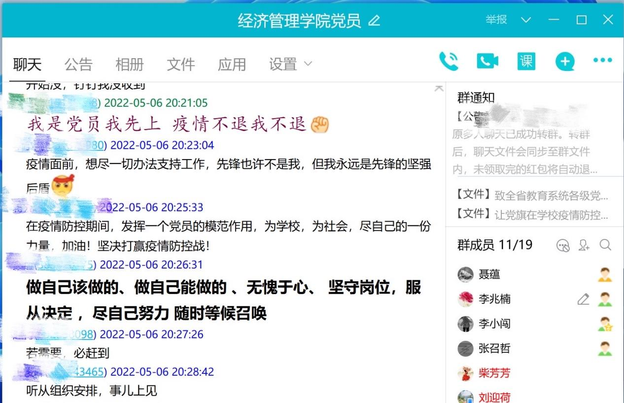 最后,全体党员教师共同学习文件精神,分享近期学生管理、教学工作心得体会,纷纷表示只要党组织需要,定会第一时间响应号召、听从指挥,责无旁贷投身疫情防控攻坚战,做到“守土有责、守土尽责、守土担责”。