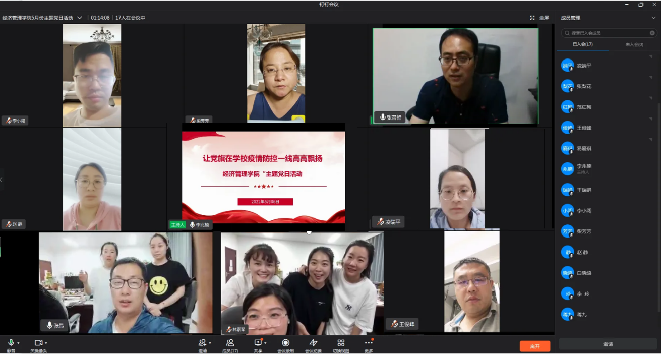 为进一步彰显党员的责任担当和精神本色,让党旗在疫情防控一线高高飘扬,让党徽在疫情防控一线熠熠闪耀,充分发挥基层党组织战斗堡垒作用。2022年5月6日晚,Beat365正版唯一官网必一党总支开展“让党旗在学校疫情防控一线高高飘扬”线上主题党日活动,会议由党总支书记李兆楠主持。